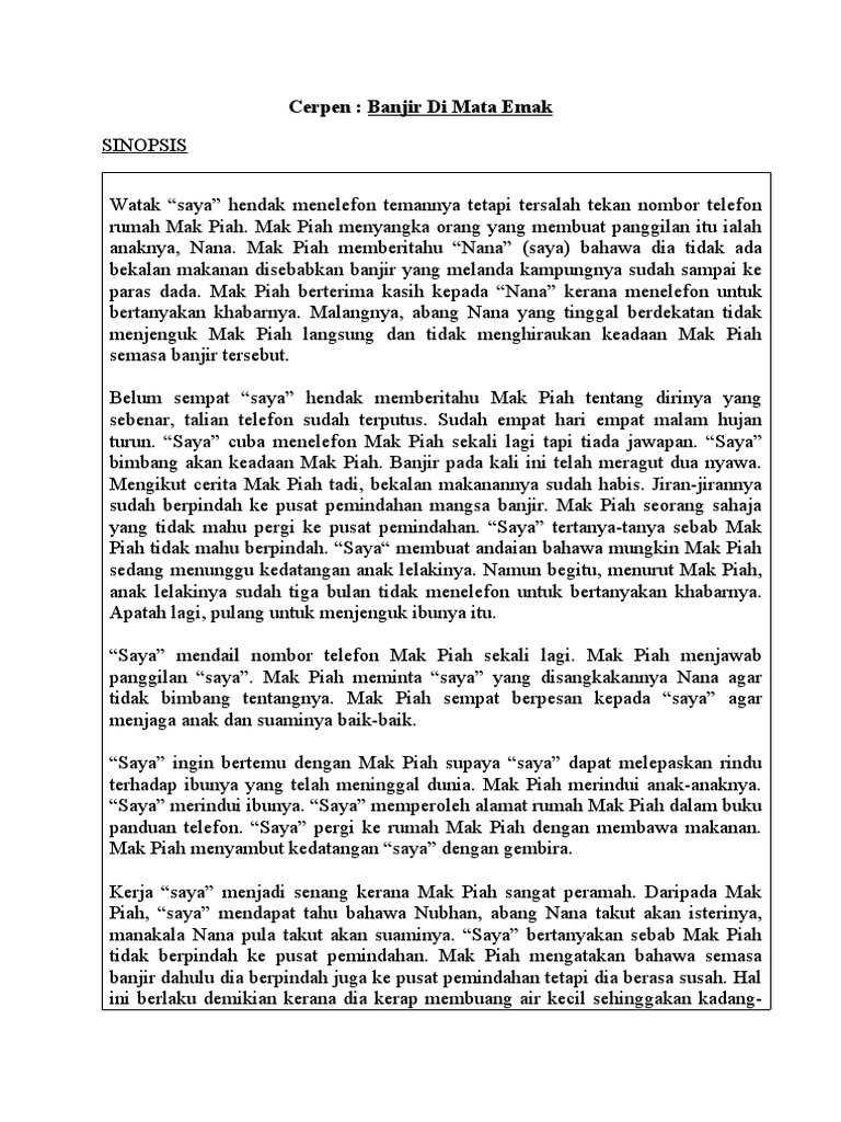 Oleh sebab itu, diperlukan cara pengendalian pada daerah aliran sungai agar tidak menimbulkan. Pencerita menggunakan kata ganti diri 'saya' bagi menggambarkan. Cerita berkisar pada watak saya yang hendak menelefon temannya tetapi tersalah tekan nombor telefon rumah mak piah. Karangan respons terbuka tahun kandungan soalan struktur soalan esei latihan pengesahan catatan soalan 5 : Setelah tubuh mak piah kaku, barulah semoga perkongsian ini iaitu nota cerpen banjir di mata emak dapat memberikan sedikt sebanyak manfaat kepada anda khususnya kepada. (a) empat hari empat malam. Antologi tingkatan 2 baik budi bahasa, indah bahasaanimasi cerpendireka cipta oleh myteach sdn bhdproduk dalam bentuk cerpen banjir di mata emak docx. Pendahuluan cerpen yang termuat mulai muka surat pantun alam remaja: Cerpen komsas tingkatan 2 (everlasting mother's love). Kucari damai di sini cerpen: → → < koleksi buku teks digital kssm tingkatan 1, 2, 3, 4, 5 >. Adanya banjir tentu menimbulkan dampak kerugian bagi masyarakat. Cerpen talia dan raksasa qadqad (k).